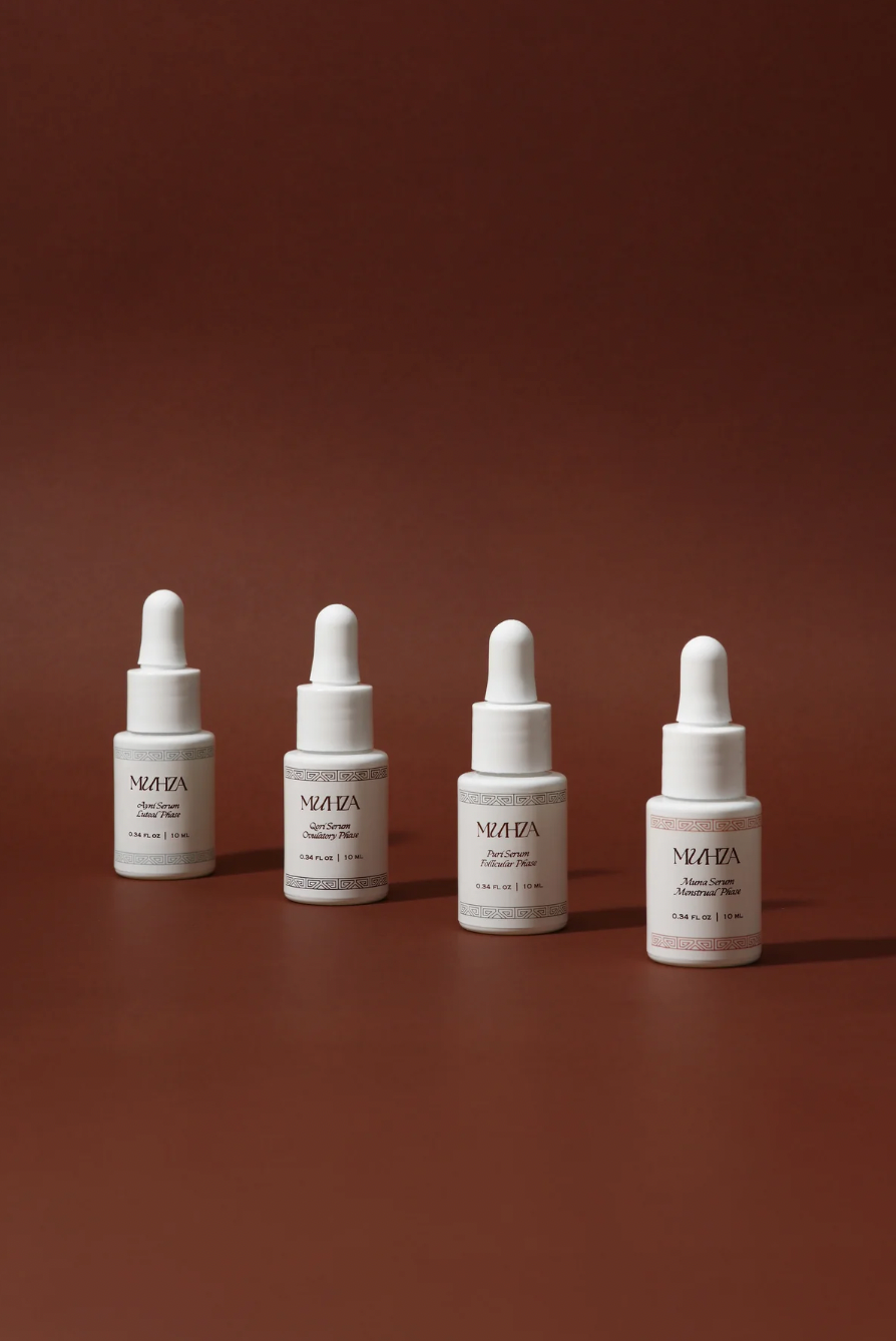 Naturally, the Muhza system comprises four serums. The Muna Serum provides hydration and supports the skin barrier using prebiotics, probiotics, peptides, and hyaluronic acid during the menstrual phase. The Puri Serum encourages gentle renewal through fruit acids and mandelic acid, promoting exfoliation and skin resurfacing, during the follicular phase. The Qori Serum shields and balances the skin with bakuchiol and licorice root extract, reducing hyperpigmentation and boosting collagen, during the ovulatory phase. And finally the Ayni Serum calms inflammation and soothes the skin using lactic acid and salicylic acid, addressing issues like acne and redness, during the luteal phase.